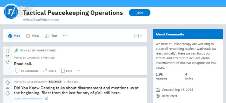 第一个专门设立的子版块叫做“慈善事业”(Philanthropy),名字取自《合金装备2》的同名组织,拥有超过1900名活跃用户,致力于实现“无核结局”。