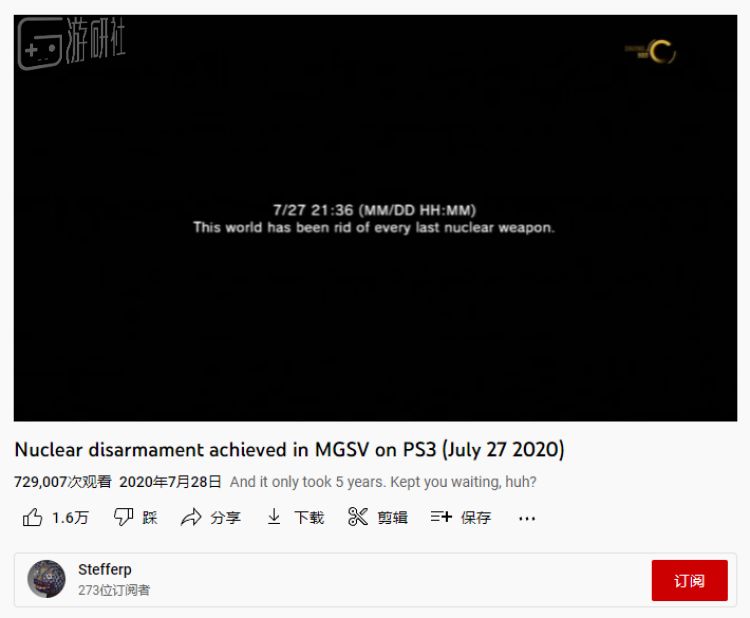 2020年7月27日,《合金装备5》PS3端的“无核结局”过场动画触发,“反核帮”成员Stefferp将动画录了下来,在第二天上传到Youtube。