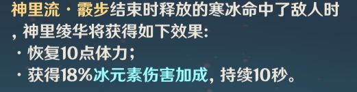 1.双冰共鸣:提高暴击率、先手挂冰、为绫华充能(冰队友释放战技E,切绫华吃冰微粒)