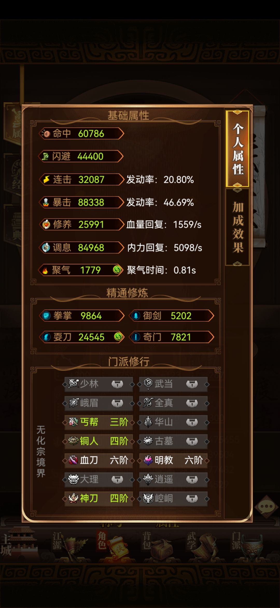 1.1,经脉、典籍、武学、装备、称号是你属性的主要来源,称号低v看自己情况高v一定要跟称号是被动属性可以让高v和低v拉开差距 2.武学:菩提能出的一定要出,前期的武学都是过度的,到了六阶,武学基本成型,一般是门武,百步飞天,菩提,门内或葵花,剩下俩个位置放红色外功或者金色自创。 2.1,前期的元宝不要乱花,攒钱出神功,什么是神功呢,不是那种名字带神功的比如葵花神功,而是需要开箱子得到的内功,除了明玉神功是15万元宝左右的资源可以得到,其它的强力神功都是30万元宝左右,出完神功出配套的轻功。 3,门派,这游戏分为奇门,剑法,刀法,拳法,v15以下请玩奇门,剑法,刀法,v15以上可以选拳法,奇门最强的是唐门,走闪避的话可以选古墓,剑法选武当强的一批,刀法选血刀或者神刀不要玩铜人和明教门武太垃圾了,不要怕强的门派人多,这游戏6阶之后基本一个服只有10几个人,低v和大佬关系混好点,大佬不玩了你就可以白嫖大佬账号了