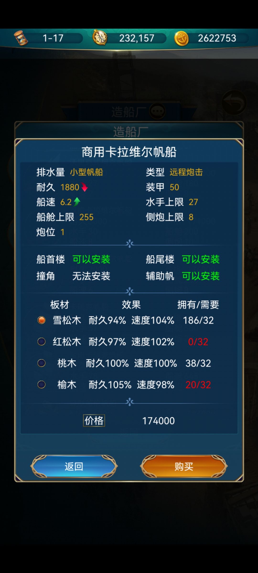在码头拿出你的船队,开始你第二段跑商生涯。由于我们的新船又慢又小,只能跑顺天府天津卫汉阳这条最短的商路,沙漏和旗子可以一直开着。中间路过遗迹的时候可以白嫖一次,所以养成进港口第一件事就是喝酒的习惯。黑市只买药剂沙漏旗子和炸药包。攒够大概三四千万的时候,只用探飞(码头的舰队编制功能可以用一下,跑商一个,探险一个,战斗一个,方便来回切换)去日本炸一波红木,暂时需要1200,还有绳索麻布料。可以在遗迹剽,不够在工会用紫檀木换。