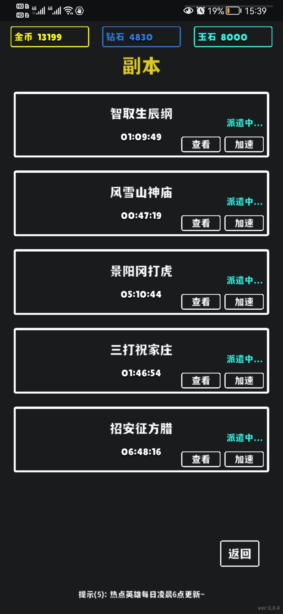 游戏内容:上线收资源,十连抽卡片,凑齐108个好汉,升星突破收益最大化。