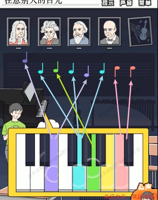 60.点击钢琴键盘,每点击一个按键,按键就会出现一种颜色,记住每个按键的颜色,对照上面的音符,依次点击对应颜色的按键,消除所有的音符,上面最右边的画框掉落。60