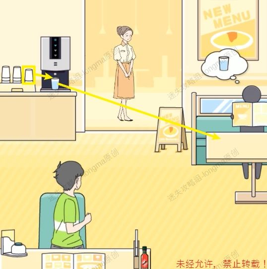 63.点击饮水机旁的杯子,使用【杯子】在饮水机处接满水,将接满水的杯子放在看书客人的桌子上。63