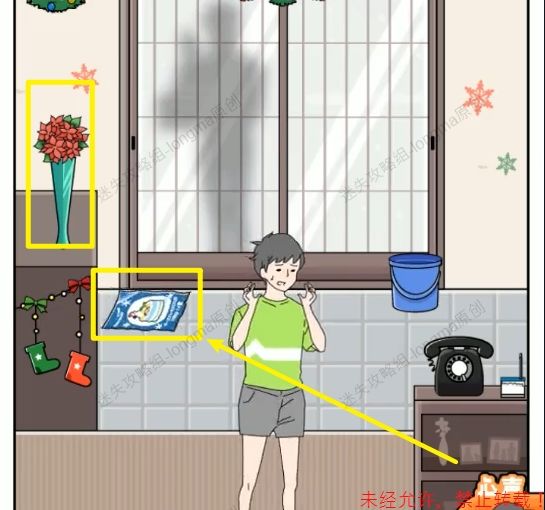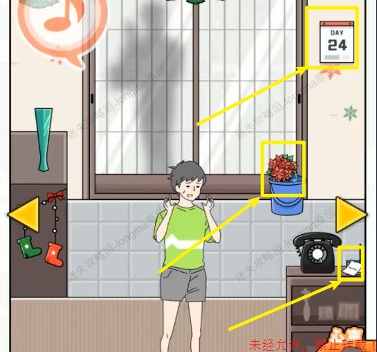 46.拾取墙上的【日历】,电话右边的【电话纸】,桶里【鲜花】。46