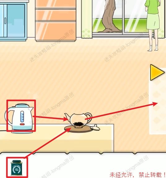 70.来到左边的场景,打开左边的柜子,拿走里面的【茶叶】,打开烧水壶,将茶叶倒入茶壶,水开后将水倒入茶壶,拿走茶壶,来到右边场景,向桌子上的茶杯倒茶。70 70.1