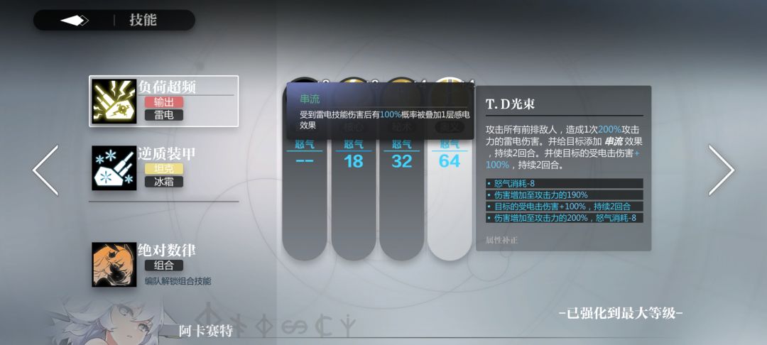 在论坛里如果你去问萌新练什么好,绝大多数的答案都是感电。凭借着通用性高,好上手的特点,当你用感电队打通主线时,相信你对游戏的理解和玩法有了自己的理解(主线第八章所有的怪死了都会在2回合后复活同时血量巨高,低练度下感电队是个很好的选择)。即使你没有阿卡王女,我还是建议你向着感电队靠拢,尽量从冰池子里捞出阿卡王女。因为每个角色都有2套不同体系的技能,所以一个角色往往身兼数职。阿卡王女凭借着优秀的技能组,即使在别的队伍里往往也是重要的辅助或者主坦。