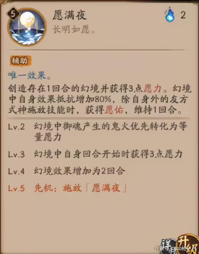 这个技能升满级的效果是先机放愿满夜,幻境持续回合增加到2回合,并且在幻境中自身回合开始时获得3点愿力,在幻境中御魂产生的鬼火优先转化为等量愿力。