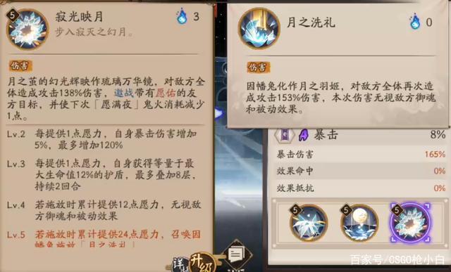 三技能【寂光映月】,对敌方全体造成攻击138%伤害,邀战带有愿佑的友方目标,并使下次【愿满夜】鬼火消耗减少1点。技能升到满级后追加三种效果,一是每提供1点愿力,自身获得等量于最大生命值12%的护盾,最多叠加8层,持续两回合;二是释放时累计提供12点愿力,无视地方御魂和被动效果;三是释放时累计提供24点愿力,召唤因幡兔释放「月之洗礼」。