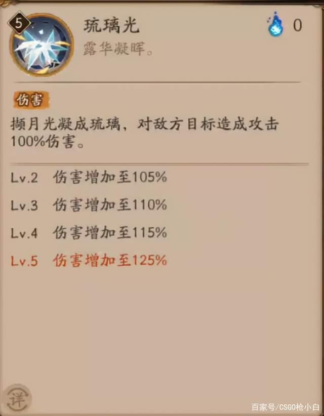 接下来看看技能,一技能【琉璃光】,普攻技,升满级后只增加伤害系数。这个技能无特殊,如果不是要解锁传记的话,可以不喂满。
