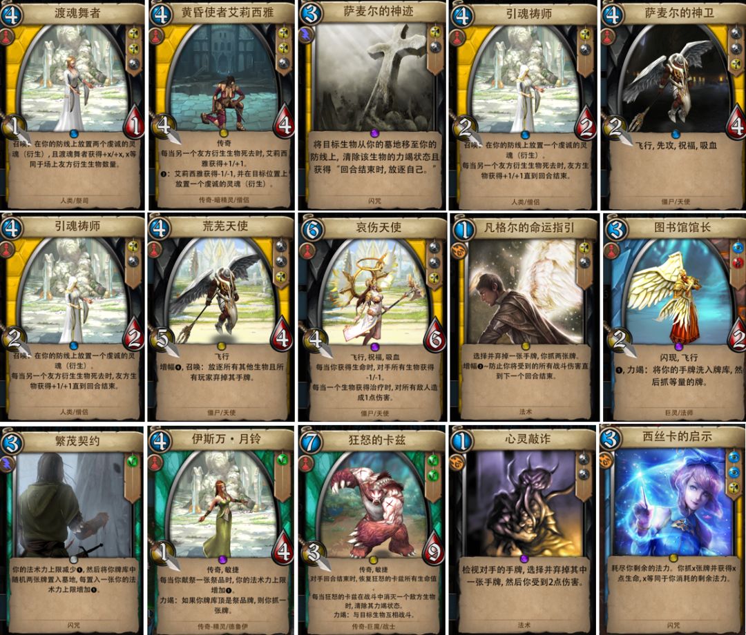 ◇渡魂舞者、萨麦尔的神卫、黄昏使者艾莉西雅、萨麦尔的神迹、引魂祷师、哀伤天使、荒芜天使、繁茂契约、伊斯万·月铃、心灵敲诈、狂怒的卡兹、图书馆馆长、凡格尔的命运指引、西丝卡的启示