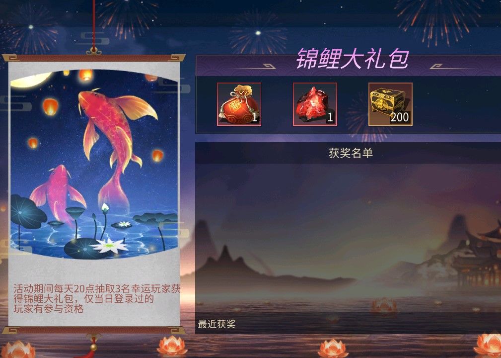 活动期间内,每天20点整抽取3名玩家获得锦鲤大礼包,仅当日登录过的玩家才有参与资格哦~,所以坚持每天都要登录哦,说不定你就是那位幸运玩家呦。