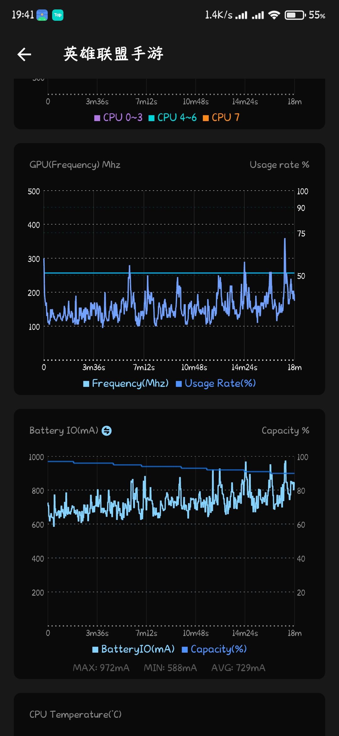 我的机型是redmi k20pro,版本miui12.5,同样的调度下,lol手游大核的使用率明显比平安京高。平安京的大核优化明显有问题,频率一直抽风,没办法维持在高频率,使用率也是忽高忽低。使用率如下图