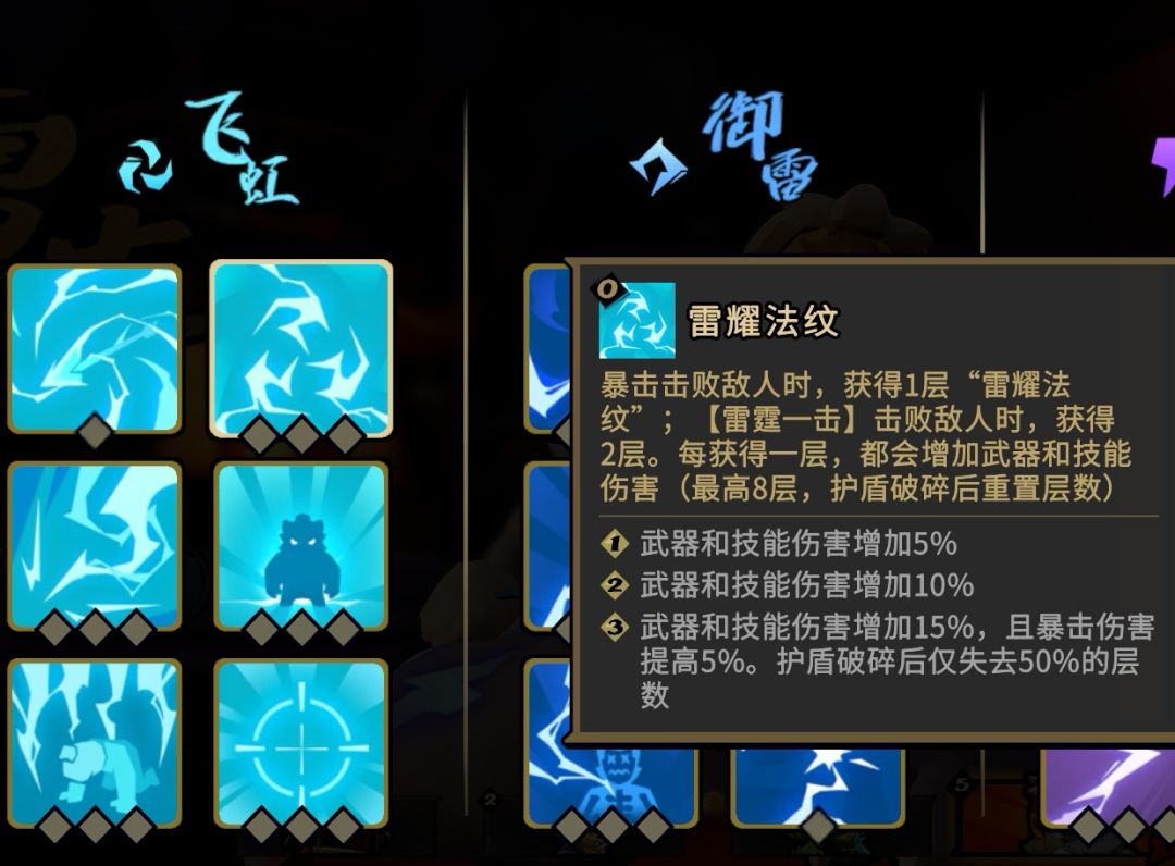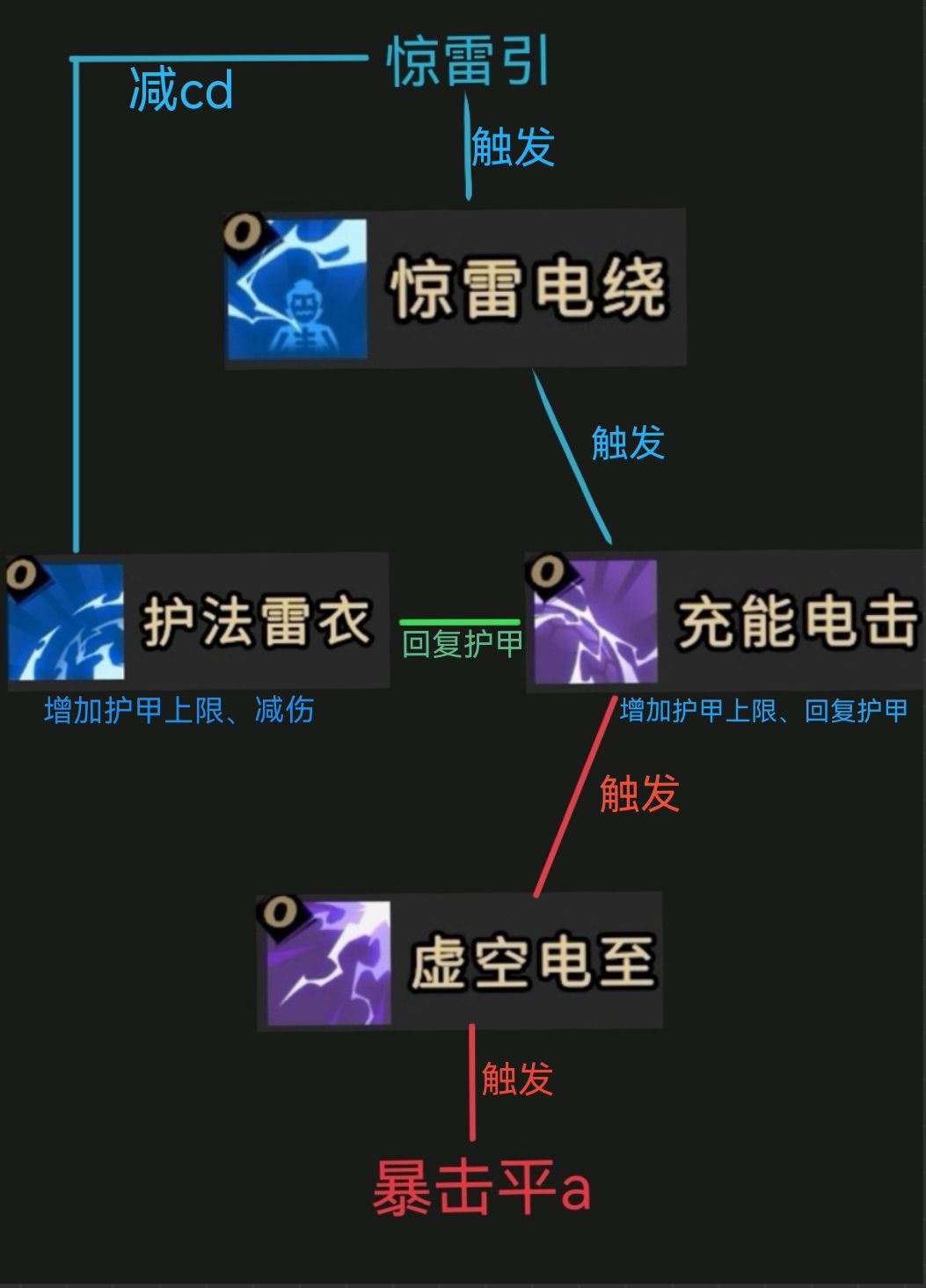 总有人说虎子是一个很脆的高输出角色,组队打boss时很多虎子都是跪了再起,起了再跪,boss一碰就碎。活着才能有输出,所以我们觉醒不能只考虑输出还要把一部分放在叠甲上。首先我们需要了解四个觉醒:护法雷衣(增加护甲上限和减伤)、惊雷电绕(惊雷引期间触发闪电)、充能电击(触发闪电后回复护甲并增加护甲上限)、虚空电至(暴击触发闪电)。