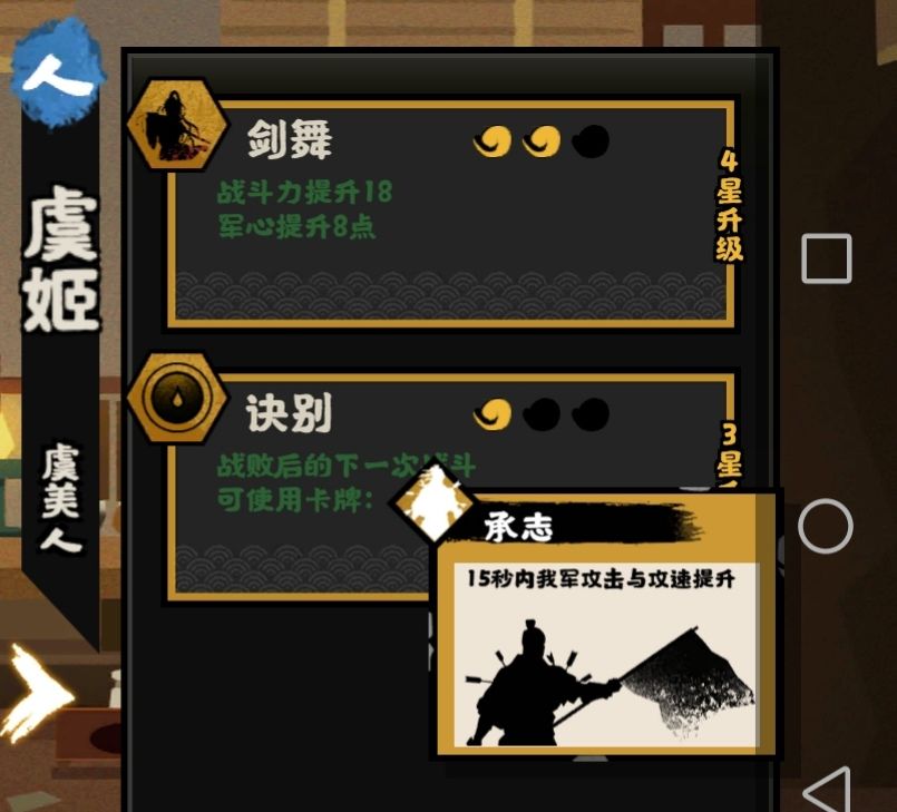 第一眼看上去,好像也不怎么样,一个加战力,一个失败给牌(技能永久,牌一次性),粮草消耗比较小,一技能3粮,二技能仅仅1