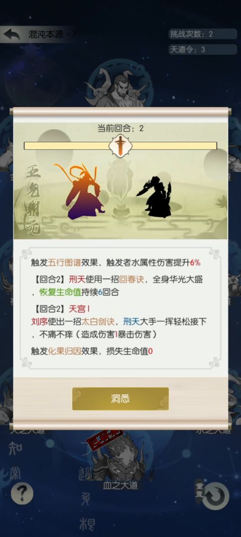 而其他本源打法和守卫之道基本一样,可以不使用剑破万法,但是注意力之大道第4回合出手,打五行之道如果使用七鬼自己会受到五斗的反伤伤害,所以伤害足够建议不用七鬼。示例如下:
