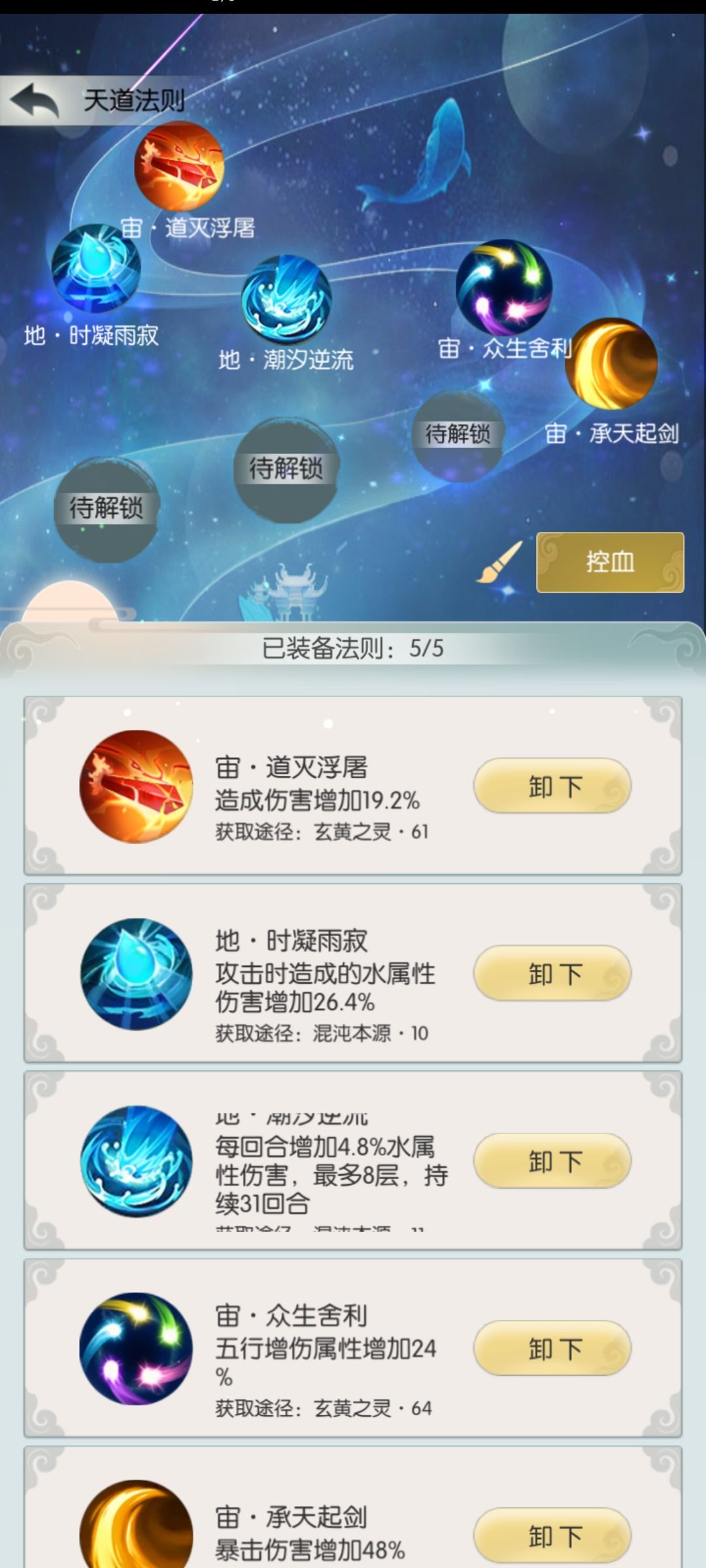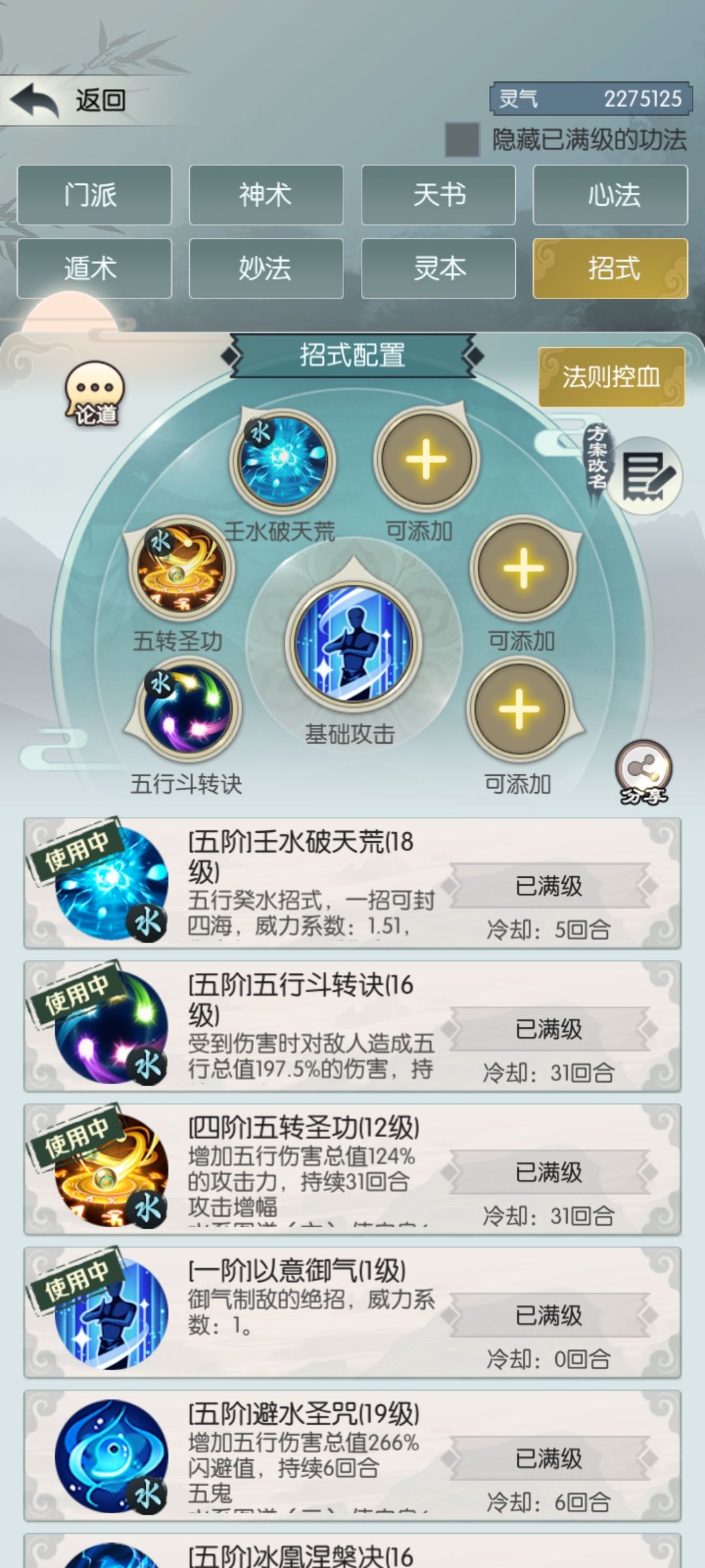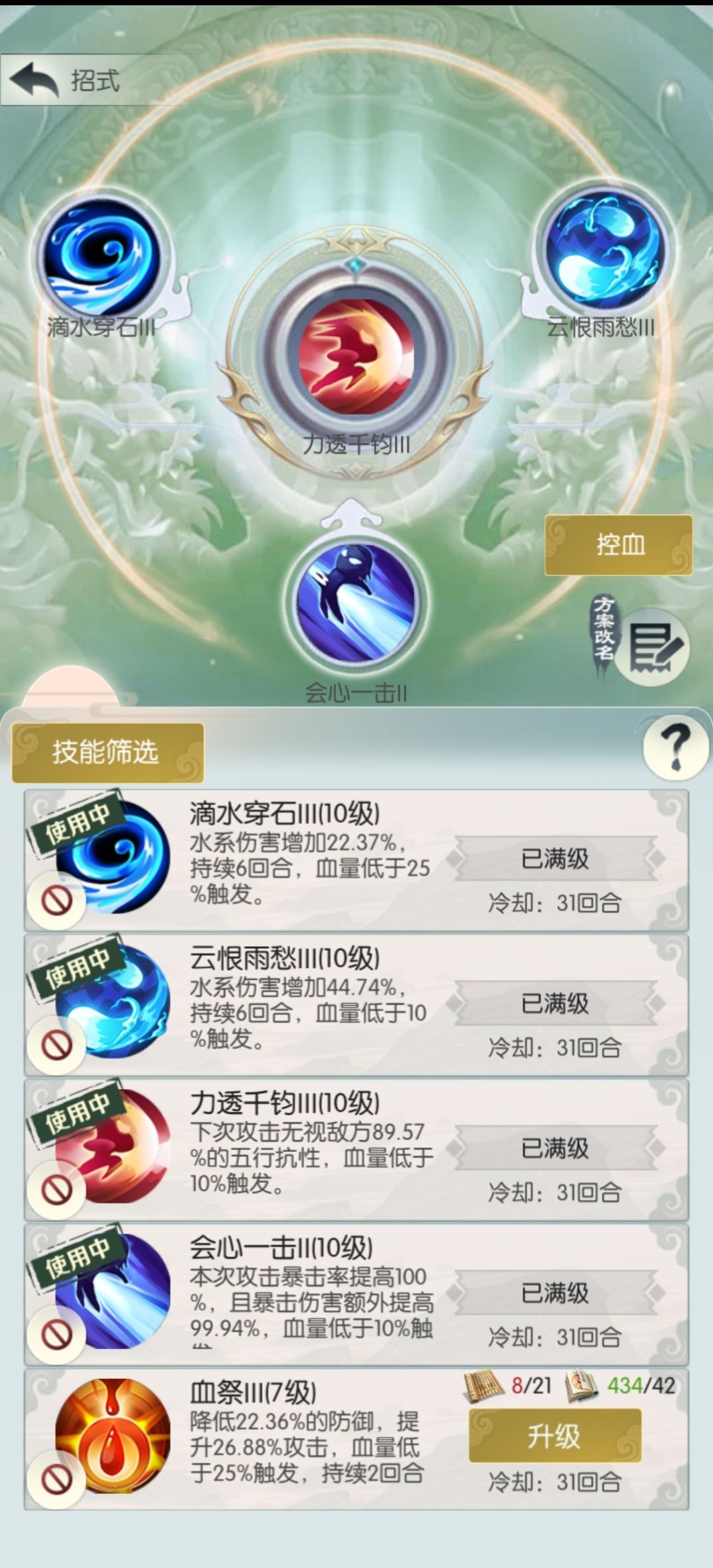 灵兽招式是控血的核心,直接影响控血的伤害。最佳搭配是会心一击,力透千钧,10%主五和25%主五,并且最好都升满级。经过测试发现同阶10级十万火急伤害加成不如1级25%主五,不如3级50%主五,因此有主五加成的灵兽技能就不用十万火急这种。