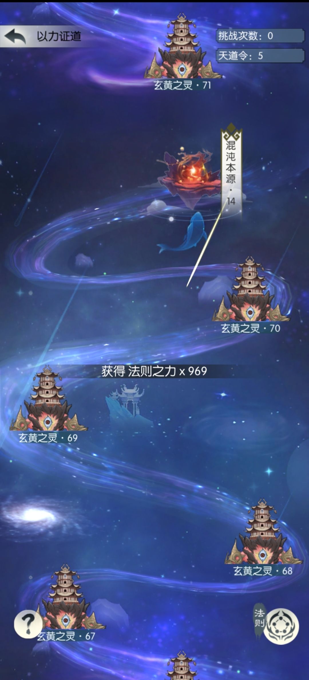 玄黄目前总共有75关,主要规律是:(1)每多1关玄黄所有属性多10%(如第1关1000w四维,则第2关1100w,第3关1200w)。(2)每个本源后出现的一关(如6,11,16,21……)玄黄招式等级会提升1级,伤害会突增。(3)42层之前玄黄怪神通主要是九阳和剑心,九阳怪的伤害比剑心怪高很多。(4)从42层开始,玄黄没有金磁,而是五岳和六丁(减伤)交替出现,且神通只有剑心。(5)从61层开始玄黄怪自身附带奖励法则加成(比如69层玄黄自带法则回天不坠,所以即便不是之前提到的突增关,造成的伤害也会突增)。(6)从72层开始玄黄没有五行归元,且第2回合就出手。