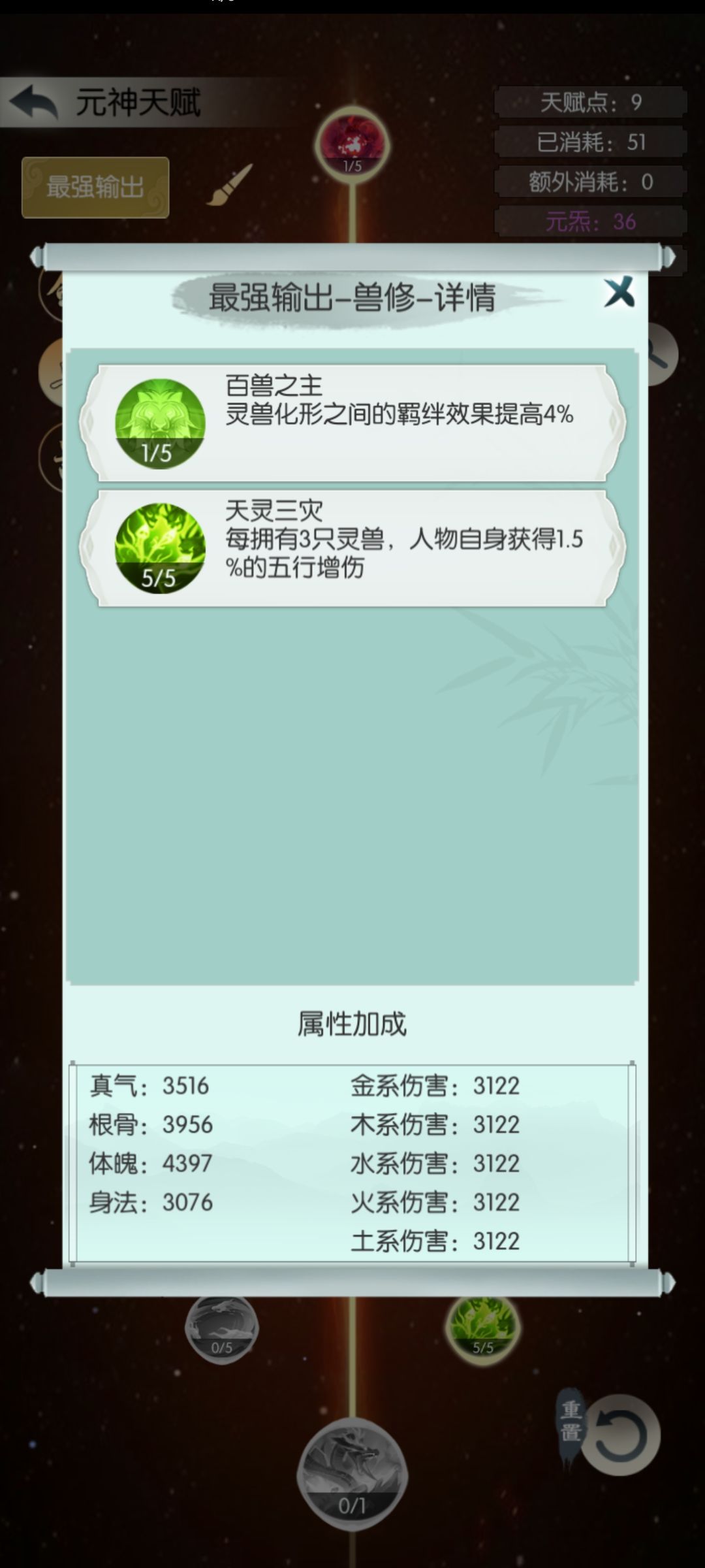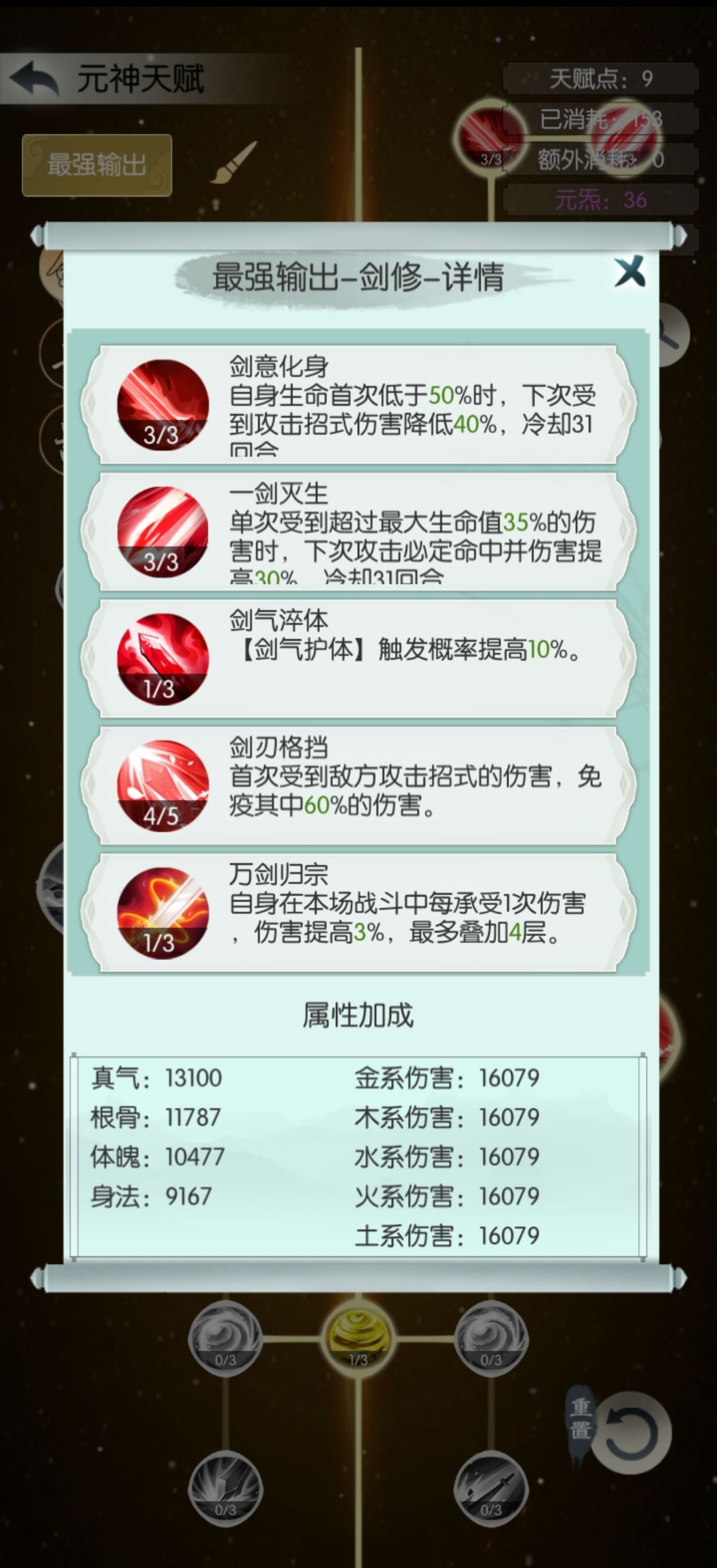 剑胎选择藏锋,神通选择五气或九阳,最近测试发现五气比九阳伤害多2.5%。元神天赋双天赋选择剑右加兽左(点到历战传承即可),单天赋选择剑右。剑右必点一剑灭生和剑刃格挡,万剑看点数点一下即可,如果有余点天灵三灾(加五行增伤)。