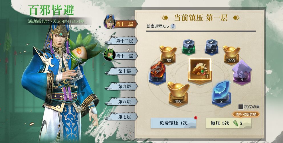 1、玩家首次进入活动有一次免费镇压邪祟次数,消耗后过24小时刷新免费次数。