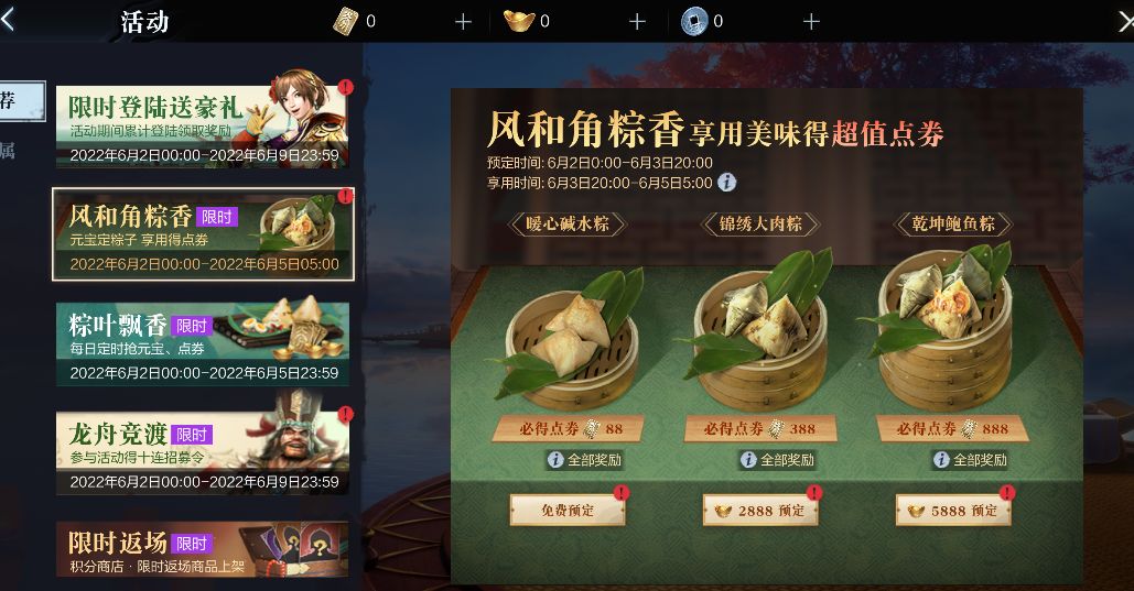 主公等级:20级开启活动时间:6月2日-6月5日二、活动规则1、除了接粽子,玩家还可消耗元宝预订美味角粽。2、预订美味角粽阶段:6月2日0:00至6月3日20:00开启美味粽子预订。如未进行粽子预订的玩家,默认获得暖心碱水粽。3、粽子享用阶段:6月3日20:00点开启美味粽子享用,根据预订的不同档位可享用不同的粽子,获得不同数量超值点券,享用美味粽子时还有概率获得稀有道具。