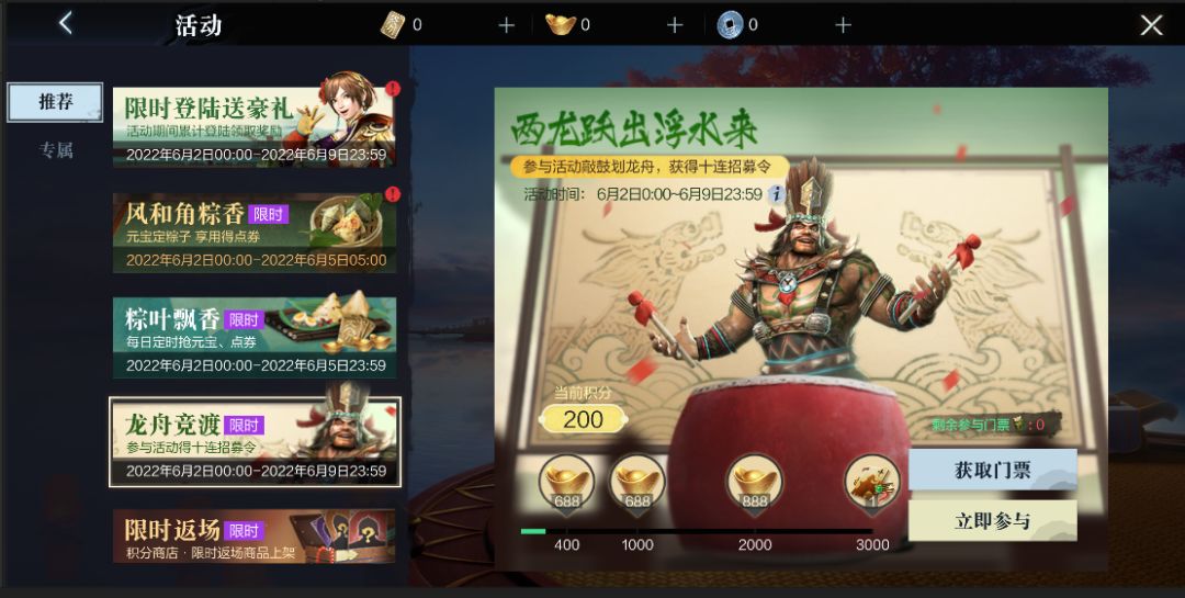 主公等级:20级开启活动时间:6月2日-6月9日二、活动规则1、玩家在活动期间可在活动面板参与划龙舟小游戏。2、玩家在合适的时机敲击鼓面,让龙舟前进抵达终点。30s内通关:200积分;45s内通关:180积分;46s及以上通关:150积分。3、积分达到一定数量可获取元宝奖励,积分达到3000可获取十连招募令大奖。