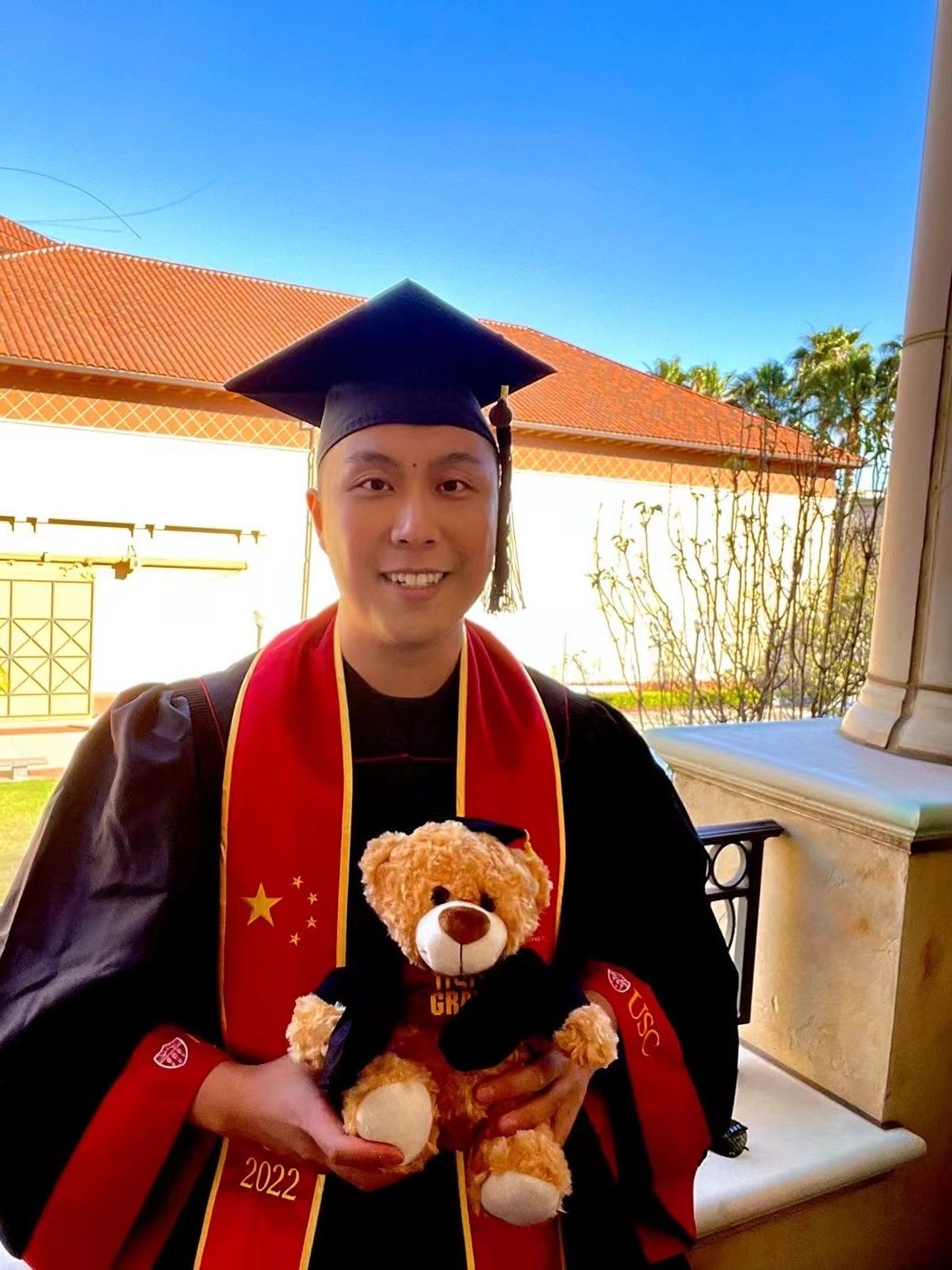 五月刚从南加大本科毕业的杨航,参加毕业典礼时特意在绶带上添加了国旗元素(图片由杨航本人提供)