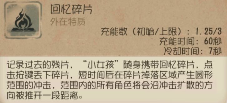 使用【回忆碎片】时会将监管者推开,如果技能生效前被监管者普通攻击命中便会取消监管者的攻击后摇,在使用时需确认自身与监管者身距以及对方否有攻击操作,避免使用时机不当而取消”擦刀”。