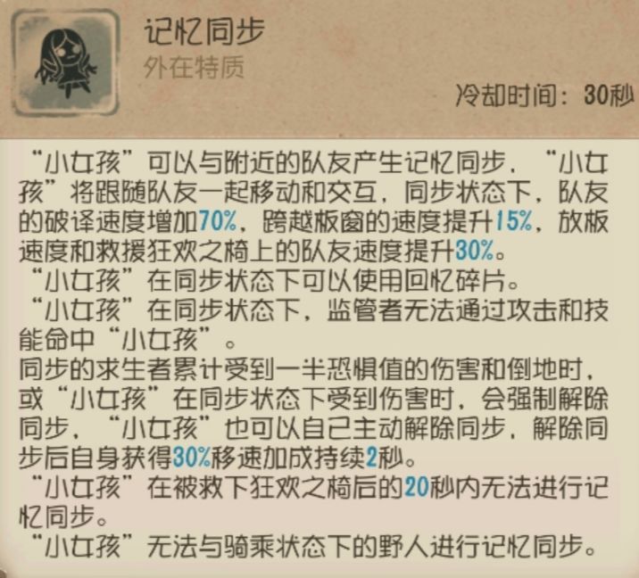 ① “小女孩”在求生者中是一个灵活多变的角色,可以通过求生者的阵容来选择天赋。“小女孩”的优势在于有着不俗的牵制能力同时还具备全图支援的特点,当监管者追击“小女孩”时可以先自己牵制,等受到一次普通攻击后再选择寻找牵制能力较强的队友使用【记忆同步】让队友接力牵制,将牵制时间最大利益化。在场上队友需要治疗时可以选择使用【怜悯】快速传送到队友身边治疗;需要补密码机时可以使用【怜悯】快速前往正在破译的队友附近,节省赶路时间;“小女孩”自身技能【回忆碎片】配合【记忆同步】可以辅助队友牵制,延长牵制时间,在牵制过程中也可以解除【记忆同步】帮助队友抵挡伤害或者放下板子。