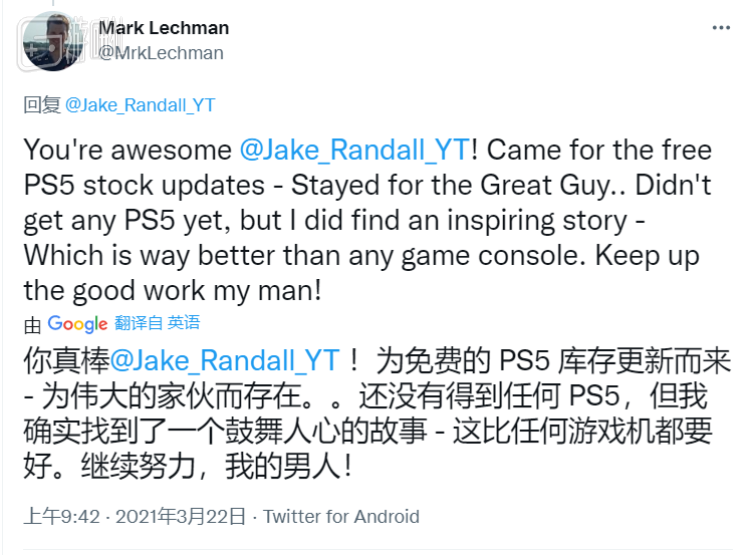 他在自己的视频中一直反复提起的是:如果你想买到PS5,可以先关注他的推特,方便第一时间收到补货通知,买到之后再回来取消。大部分人确实是这么做的,但依然有一小部分人愿意持续关注着他,其中一条评论是“Jake,我为了PS5而来的,但我会为你而留下。”