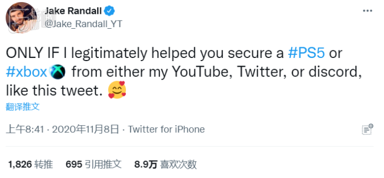 他在自己的推特上置顶了一条消息,这条发布于2020年11月的推文写着“仅当我帮您合法地获得PS5或Xbox时才点赞这条帖子。”而至今,这条推文已经得到了将近9万的点赞。