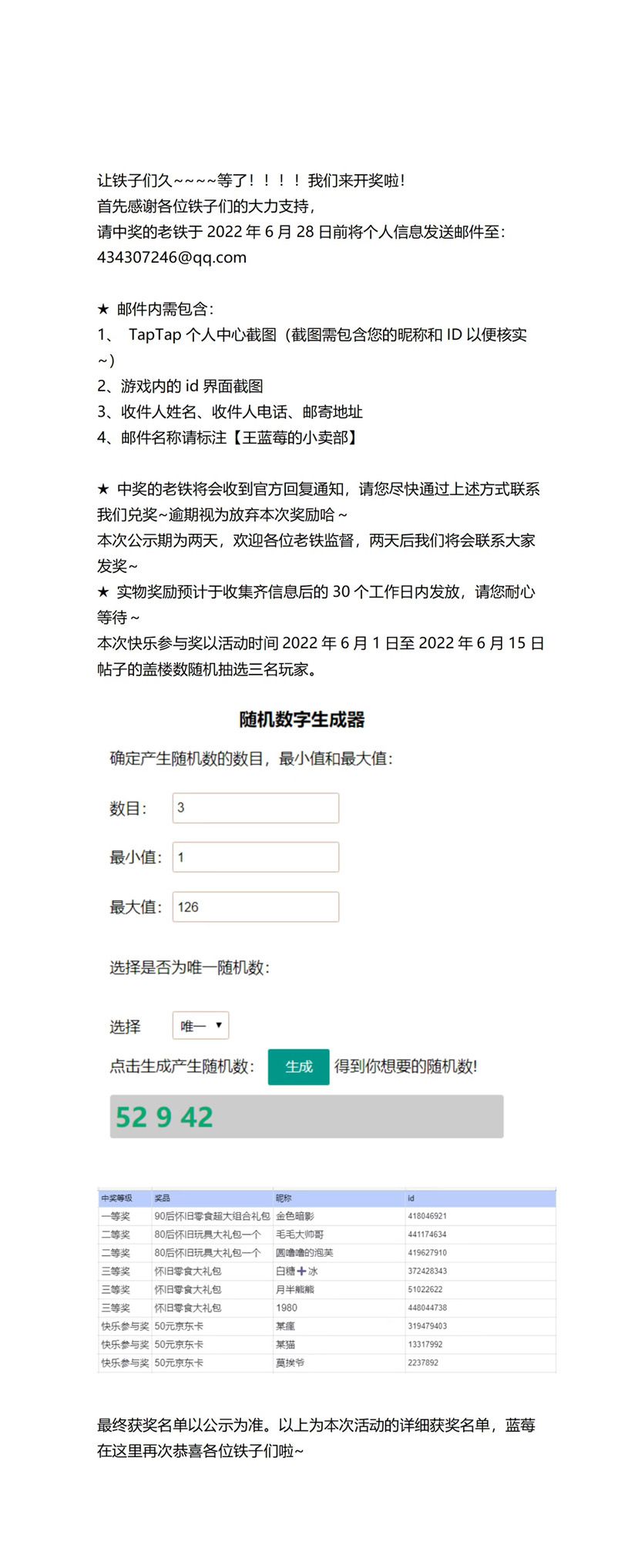 1.活动结束后,将按照活动规则从有效参与玩家中抽选幸运玩家派发奖励。获奖名单将在活动结束后的5个工作日内发帖公布,奖励将在开奖后15个工作日内发放。记得多多留意论坛消息,避免错过您的专属奖励。