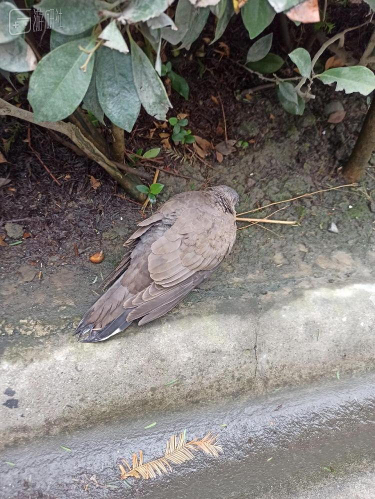 我路过的时候他缩着头一动不动,一开始我还以为它死了。走近之后发现它动了一下,甚至还想飞但是飞不动。