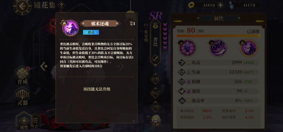 绥绥:和青鸟一样,超模R卡,技能机制在这,单体克星,解控无敌。打pvp的话6她没毛病,不打5蝶管够。灵器生命防御速度速度,同样的速度越快越好,PVP建议左边带抵抗。