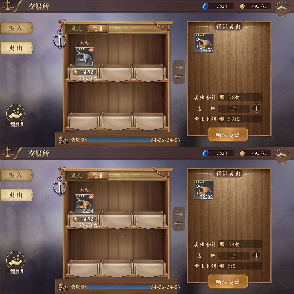 我用前面两个方法,花费半个小时轻松布局完成,然后就可以轻松海上飘、做任务、打boss之类正常玩就行了,等到出了四星商品分几次囤货,旅店休息和海上飘定时去买货物就行,满仓34000+,正常商店买卖(无压价操作)32000+就可以完成五亿利润了。