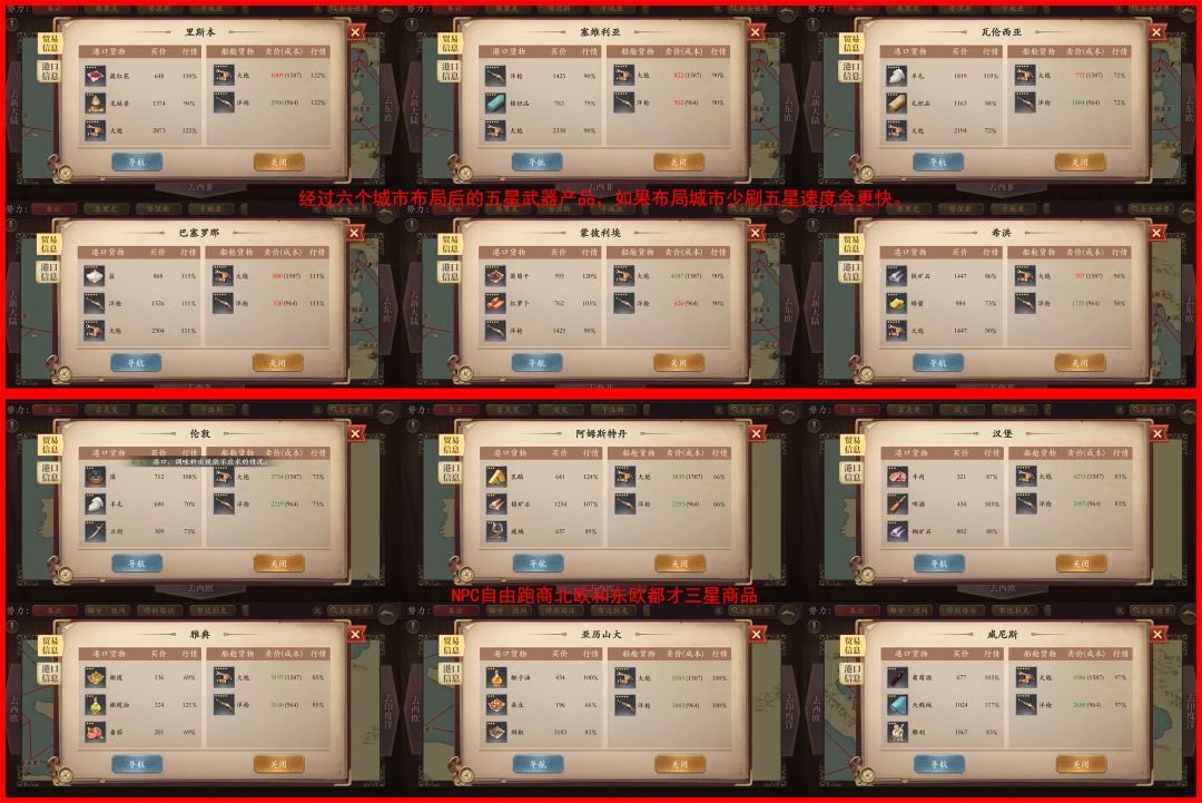 以武器为例我选西欧5个NPC,六大武器城市:塞维利亚、巴塞罗那、里斯本、瓦伦西亚、蒙彼利埃、希洪;按照上面给大家科普的硬干货,我宣战把除了这六大城市外其它城市全部100%占有度,再和平共处。很快就刷出了五星大炮、洋枪,与此同时北欧、东欧等地NPC自由状态下才刷出三星。