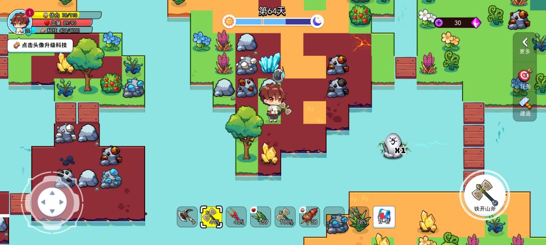 点了资源管理:前期其实并不会缺背包空间,只要你箱子够多把各种各样的物资放在箱子里采到的物资自然回到箱子里,至于单个物资上限还不太清楚(因为石头已经2000多了)