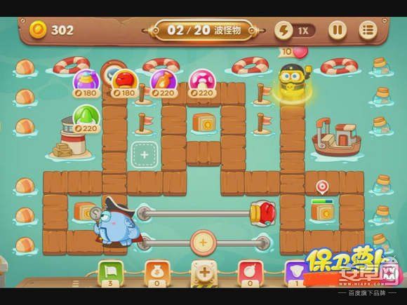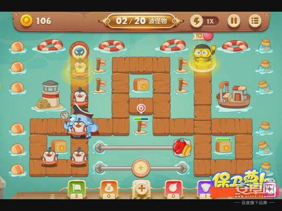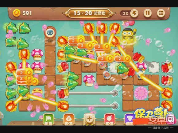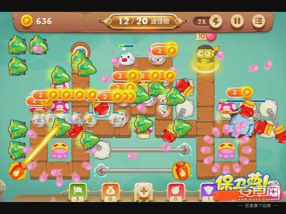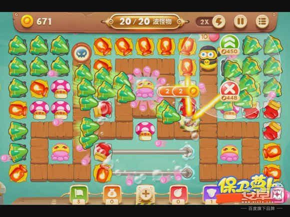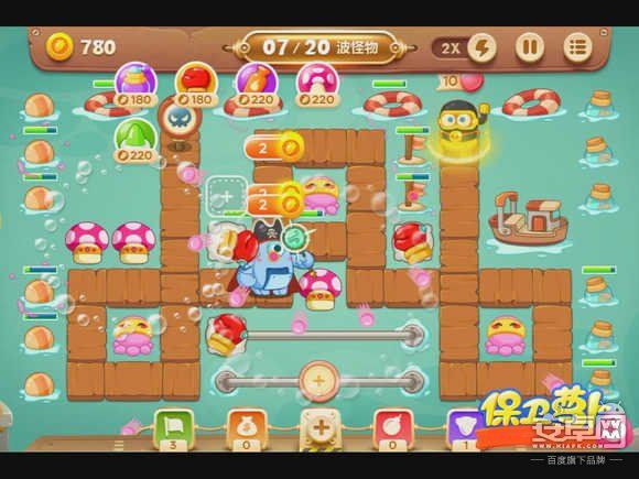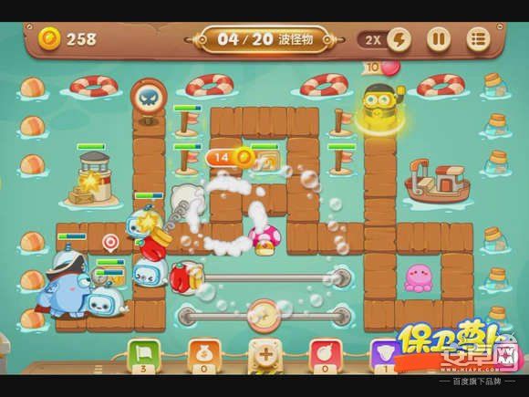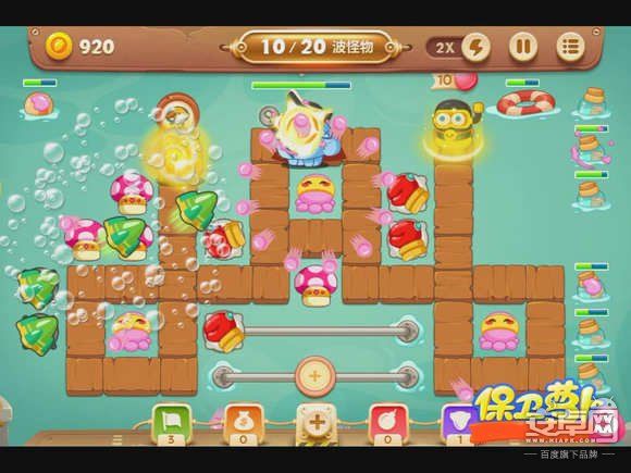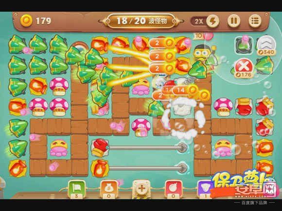 4、钱箱破后,会出现章鱼炮塔,先不要升级,而是在中间放蘑菇炮塔,减速怪物的同时还能获得一定的金钱。
