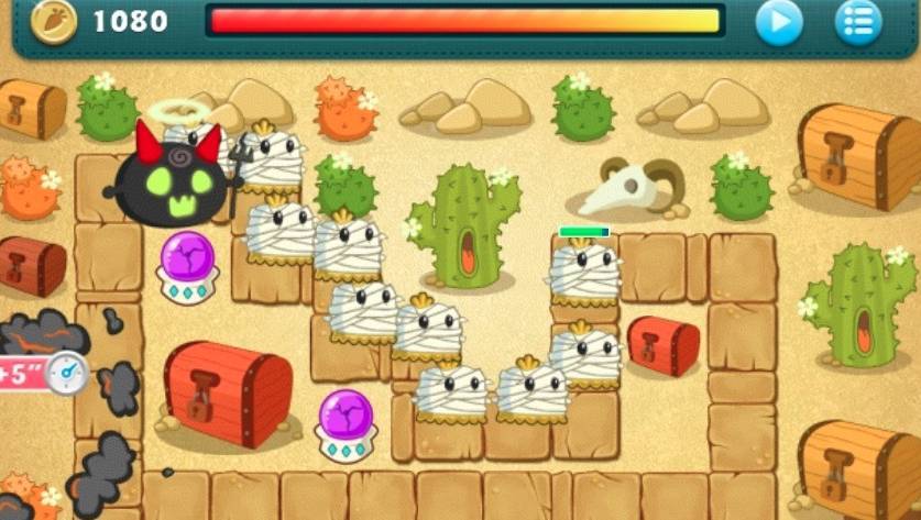 6、我们将清除Dark Angel Boss地图标记5号红色框区域,清除成功后,解锁出来是一颗炸弹,炸弹爆炸后将发生连锁反应清除更大的一块地方。将多余的游戏币用于升级防御塔,最后你找空闲时候清除Dark Angel Boss地图上的其他道具,最后集中攻击Dark Angel Boss,就可以通关了。