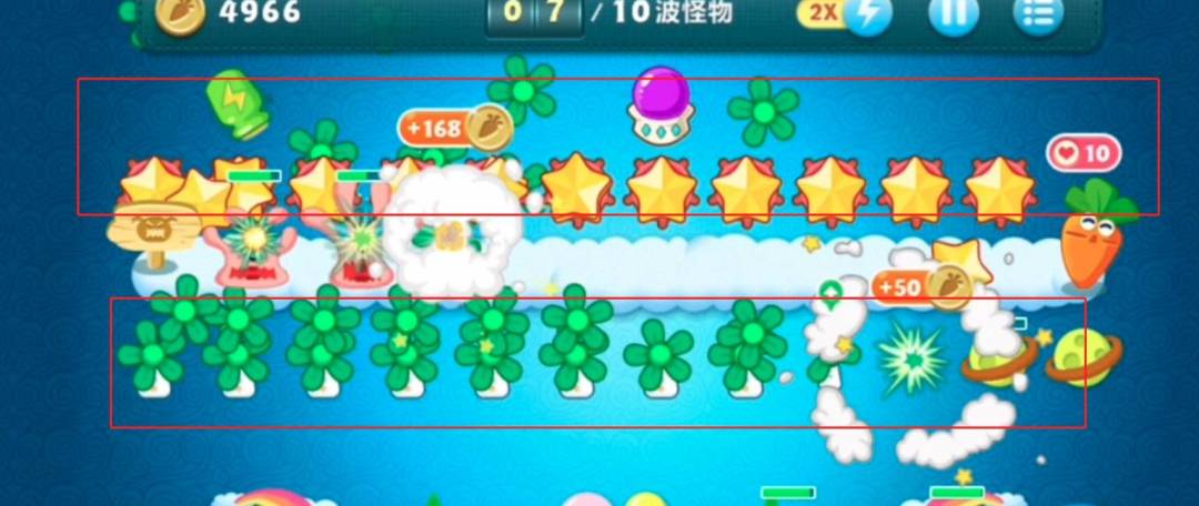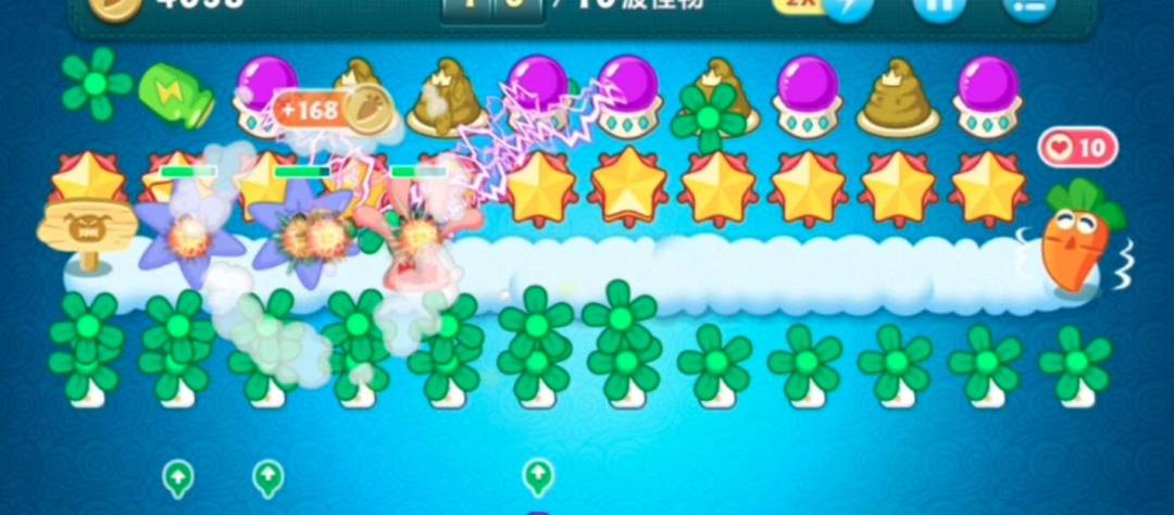 1、第一步:开局放一个瓶子和魔法球开始清理道具,第4波一定要把两排道具清理出来,期间有钱了就暂停升级炮塔。