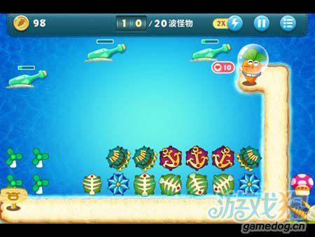 3个船锚主要用来清理道具,有钱了就放多重箭,下图位置的雪花可以在放了2个多重箭之后就升满级。之后在升级深海蘑菇。