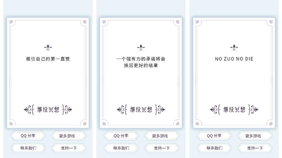 严格来说这不是一个游戏,是一款应用。使用者只需要默念心中所想的问题,点击解答之书,就能获得一句“答案”。这句话可能答非所问,可能刚刚好切中要害,如何解读,全凭玩家自己的心思了。