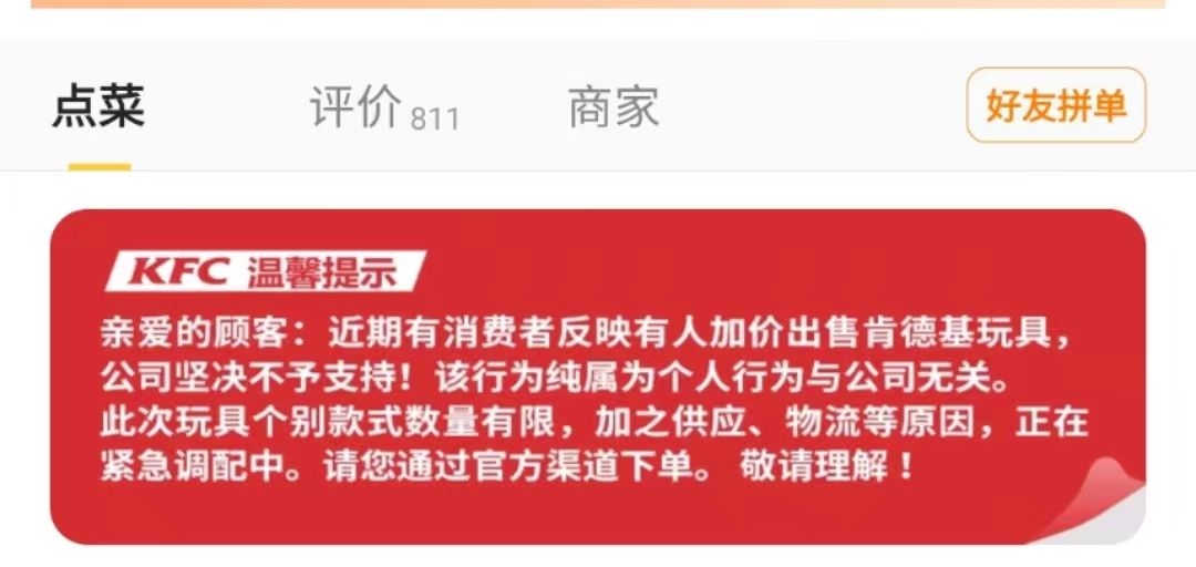 我们当然不排除这个卖家在钓鱼,但钓鱼的行为,本身就能说明一些问题。二手交易市场的价格如此离谱,以至于肯德基在线上门店出了这样的公告。