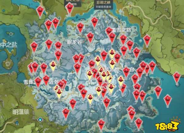 2、覆雪之路周遭山脉、山脚密集分布,8、9、10号点位的绯红玉髓,处于覆雪之路的核心山脊区域,不仅有大量的守卫小怪,同样存在很多40级以上的丘丘人,覆雪之路南部分布着大量的绯红玉髓。