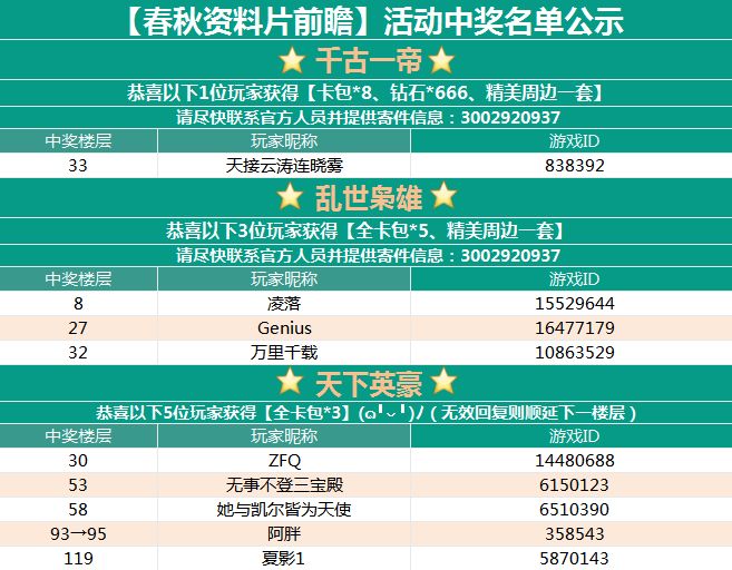 奖励道具近期将直接发放到大人们的游戏遗诏中,请中了实物周边的老爷尽快添加官方人员QQ:3002920937,并提供收件信息,我们将尽快安排快递寄送
