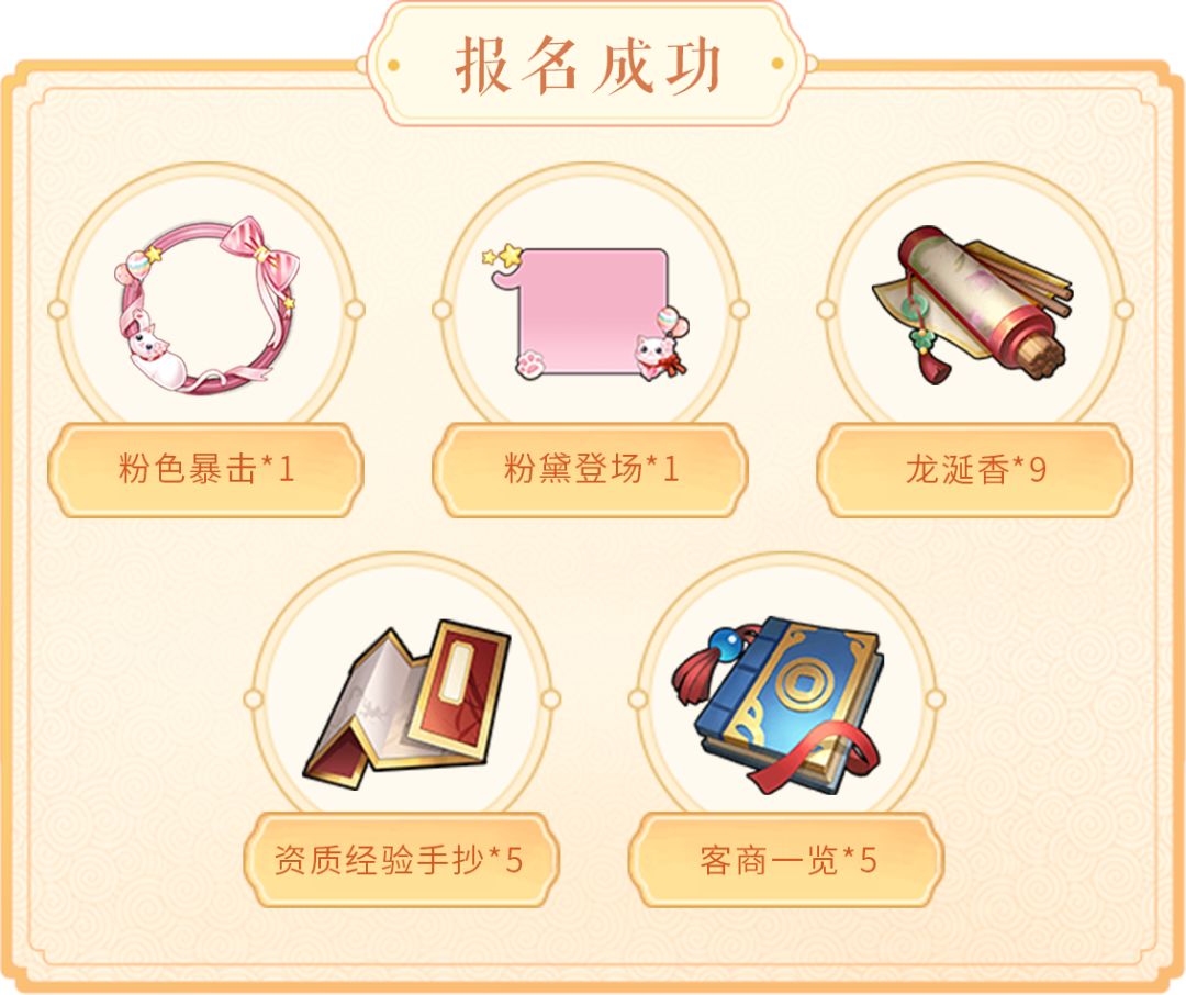 报名人数达到5000:龙涎香*1、大钱袋*2、名望礼盒*2、资质卷轴*1、十万阅历*10
