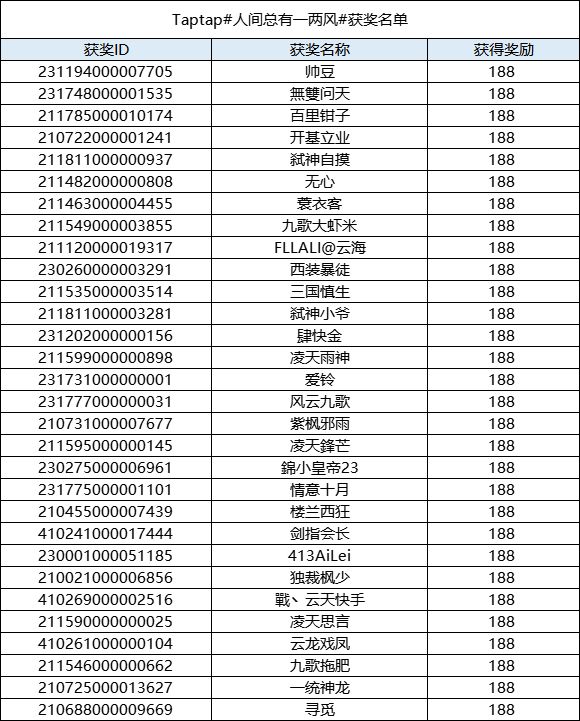 恭喜以下主公获得本次奖励,奖励会在7个工作日发布到对应的邮箱,请注意查收