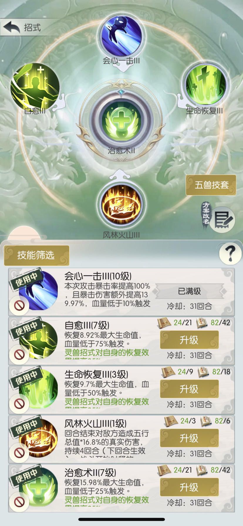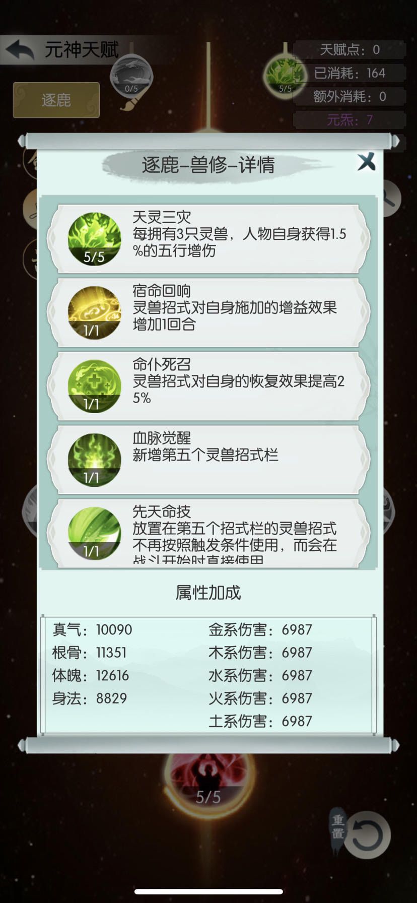 这里我第五兽技放了满级的会心3,没有会心3的用1或者2将就,没有会心就要求很高的主五属性了。
