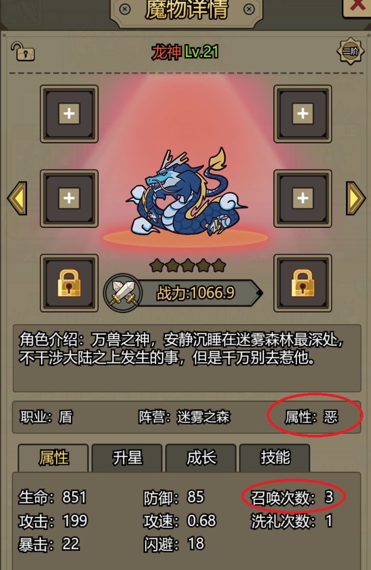 1.本游戏的开局非常重要,一个好的开局可能让你后期事半功倍,所以耐心的前期多刷一下开局会比较利于游戏的进展。TapTapREW10使用这个兑换码你可以获得180个橙碎和5000钻石,通过这些资源,你需要获得2个以上的恶属性精灵王或矮人王,如果耐心点升到21级,确认加起来召唤次数相加大于5次会更好!(不理解可见下图为恶属性召唤次数3,单只魔兽召唤数值为0-3不等)。