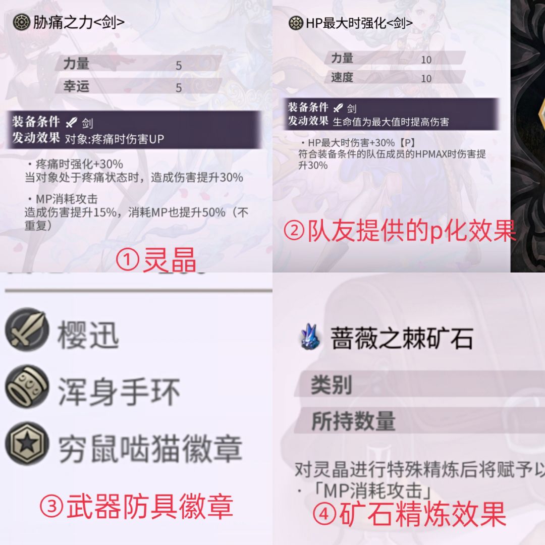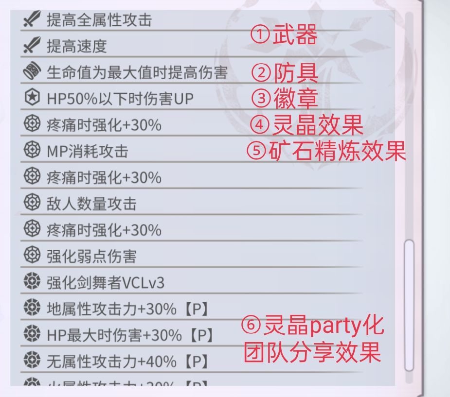 ①灵晶 灵晶p化 武器 防具 徽章 矿石等方面提供的加成都为装备效果